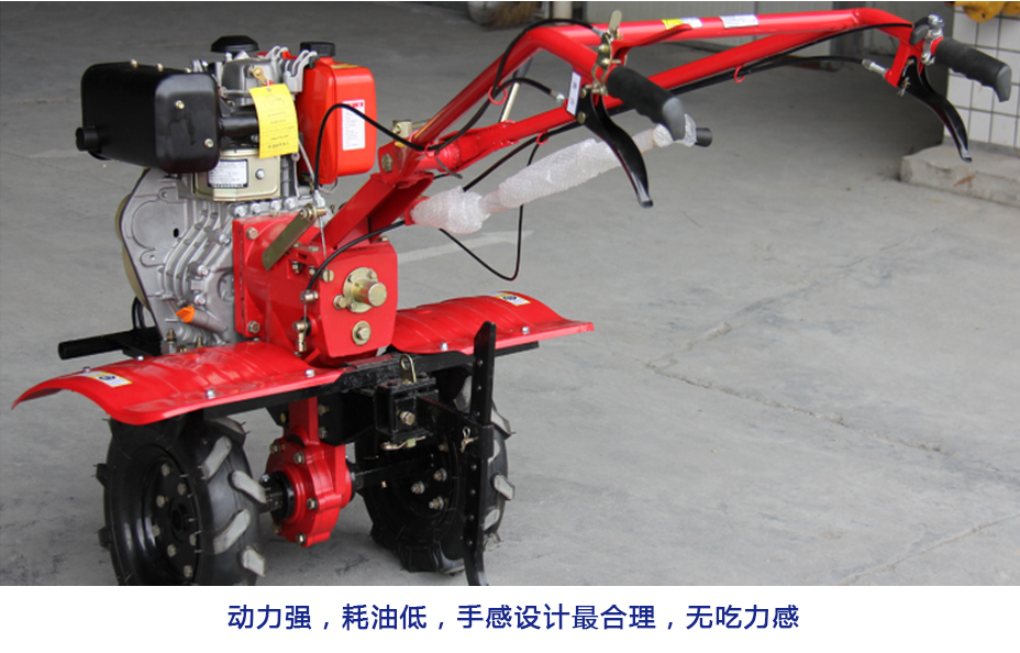 田园管理机是一种多功能小型农田作业机械。该机具有重量轻、功能多的特点,主要作业项目有深旋、喷药、复土、锄草、中耕、开沟、起垄、破碎、运输、起垄覆膜、根茎收获等。其配套动力为41kw(6马力),整机由发动机、底盘和配套作业机具三部分组成,总重量为100千克左右。